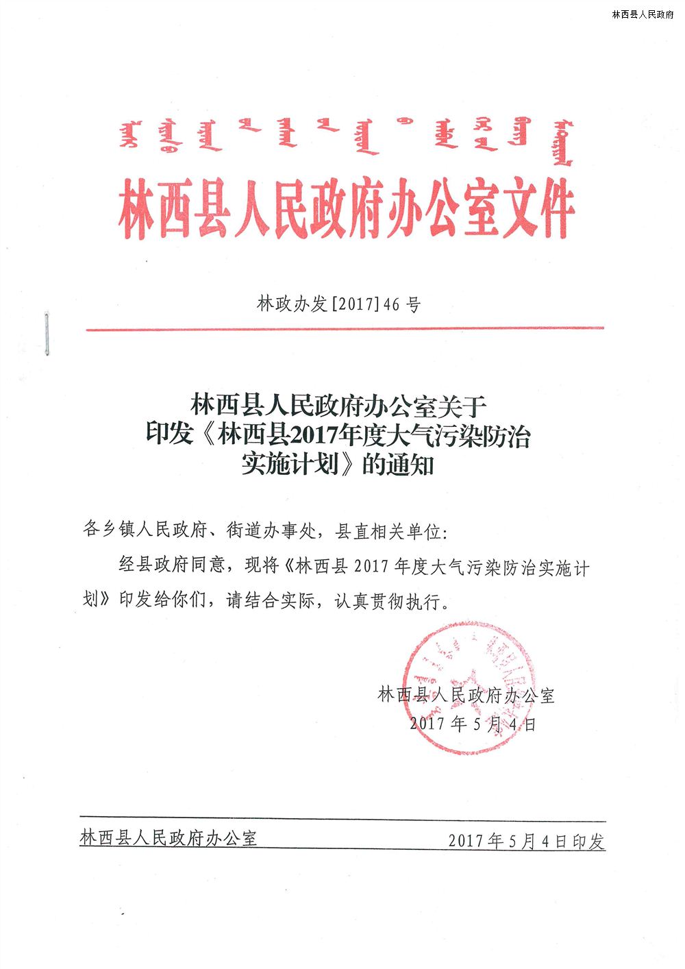 林西县人民政府办公室关于印发《林西县2017年度大气污染防治实施计划》的通知